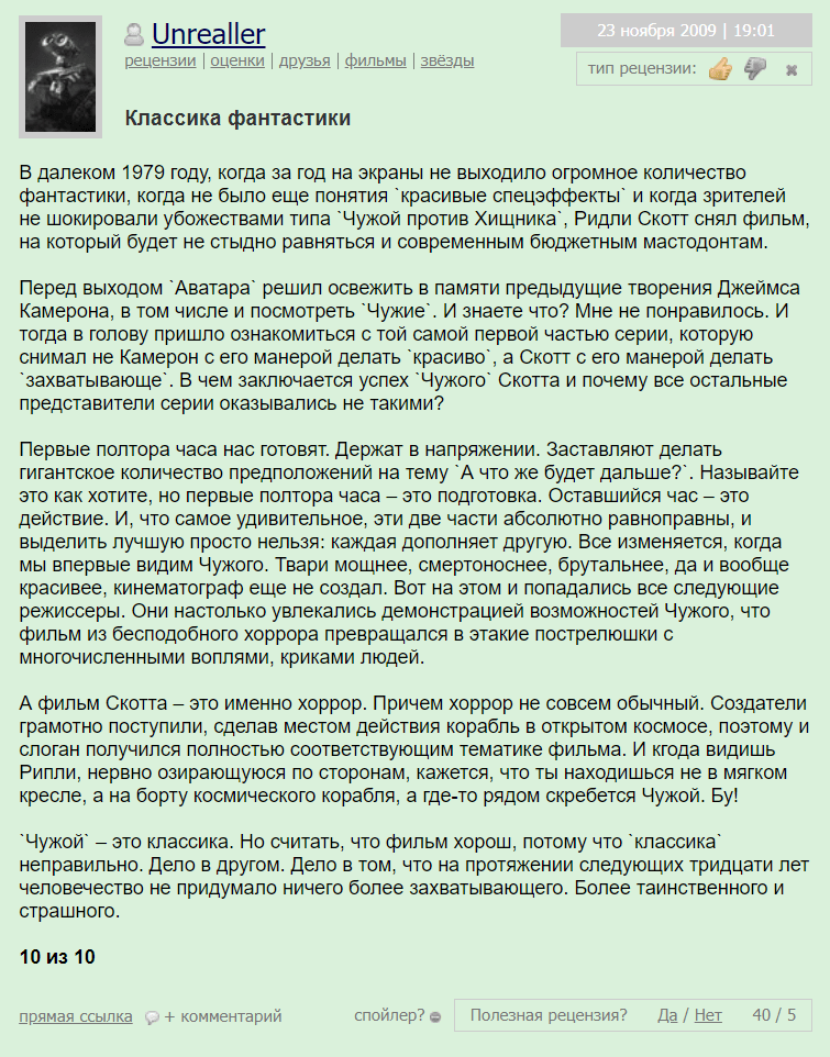Критический успех: Множество фильмов франшизы получили положительные отзывы критиков, включая первый «Чужой» и «Чужой 2», которые считаются выдающимися произведениями жанра.